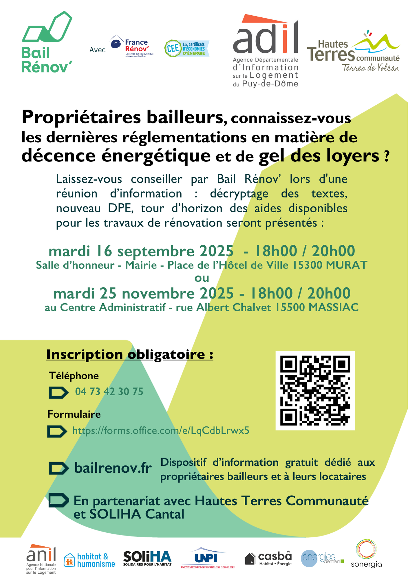 Enfin, les propriétaires de biens locatifs situés sur le territoire peuvent toujours bénéficier, sous conditions, du dispositif habitat porté par la collectivité et animé par SOLIHA Cantal (OPAH-RR 2023-2025), qui s’achèvera le 31 décembre 2025.