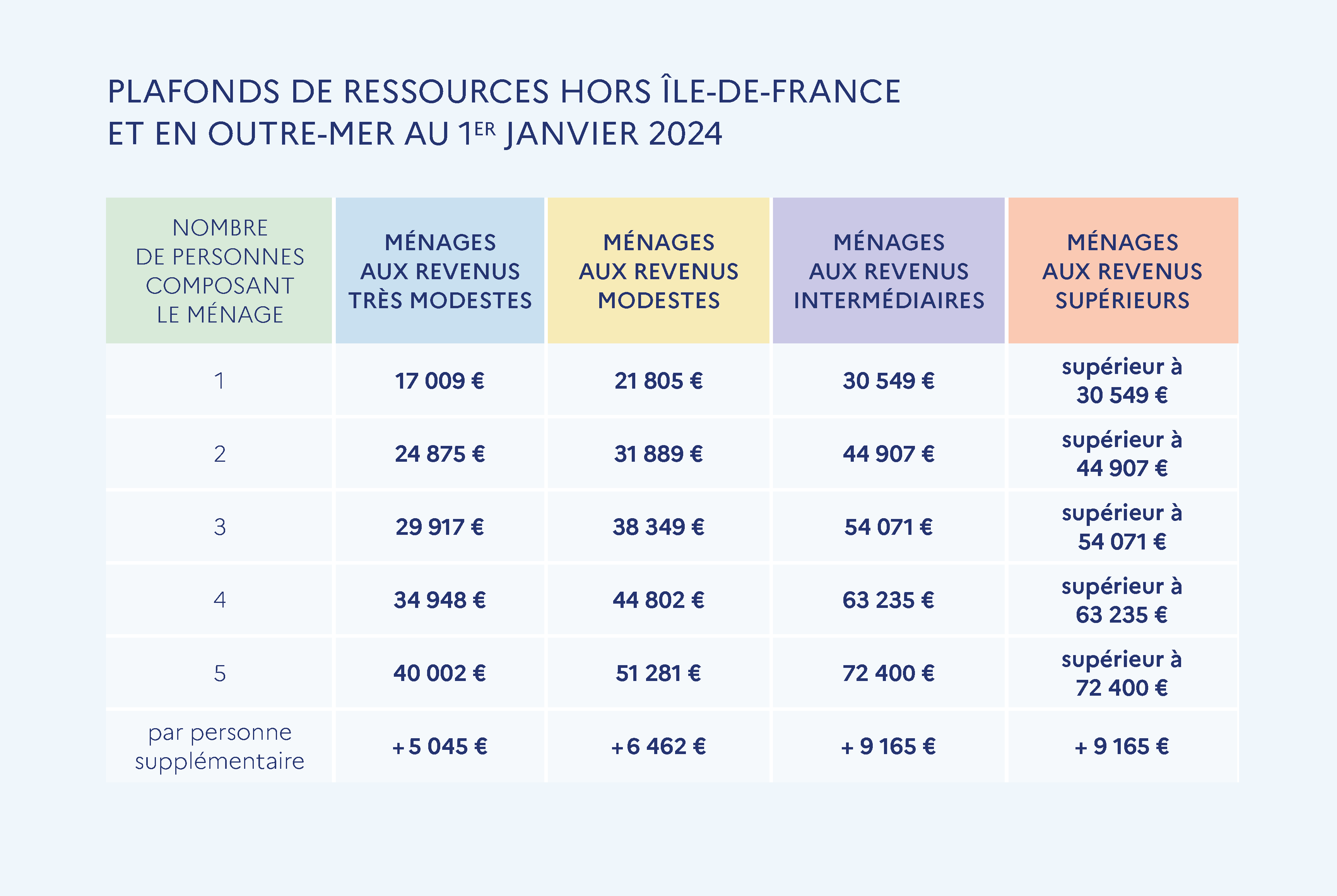 Notre association accompagne uniquement les ménages modestes et très modestes. Pour être éligible, les ménages doivent être dans plafonds correspondant aux colonnes bleu et jaune dans le tableau de l’Anah 2024 ci-contre.